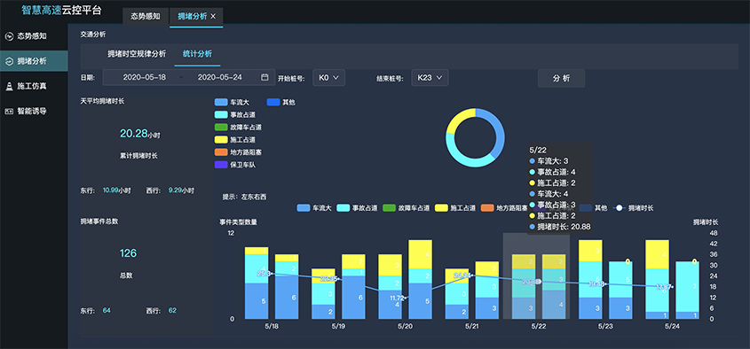 实时查看当天路网各时段的拥堵指数,支持按照日期及公里桩对拥堵进行归因分析;