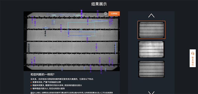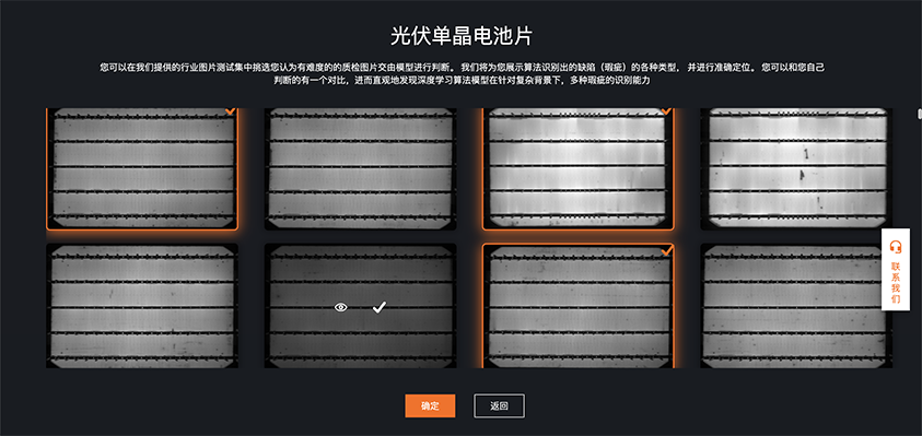 1.在系统提供的行业(场景)图片测试集中挑选您认为肉眼辨别难度较高的质检图片交由系统模型进行判断。