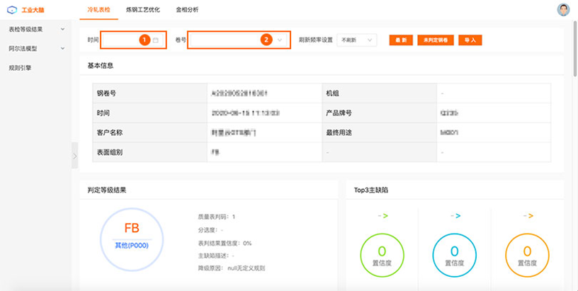 2.在(2)处选择要查询的钢卷号,页面会自动刷新结果,显示结果包括:判定等级结果、top3主缺陷、主缺陷筛选、主要质量缺陷比例、