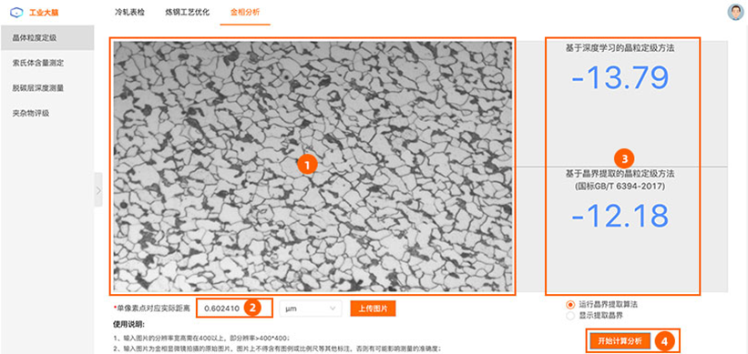 应用场景:通用金相分析场景展示。在页面下载图片后上传,即可查看分析结果。