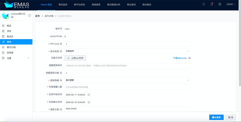 1)版本质量在完成测试回归和发布前的自动化卡口测试后得到保障,接下去按照配置好的发布计划推送更新提醒到用户手中。灰度过程支持多种发布策略,可针对品牌、机型、操作系统、灰度人数等进行多批次缓慢放量;