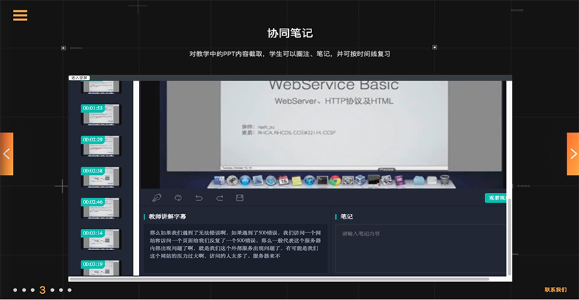自动识别视频中的PPT内容,学生通过对视频截图圈注,增加备注等方式实现课堂笔记。