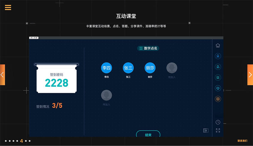 以教师视角进行展示,可采用随机方式进行课堂点名;学生打卡,支持二维码和数字两种方式;并且包含教学反馈、课堂反馈,